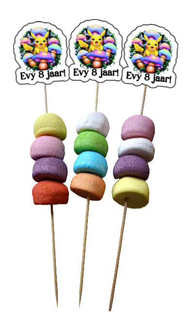 Met marshmallows in regenboogstijl en een feestelijke topper is dit dé snack voor jarige Pokémon-fans!”