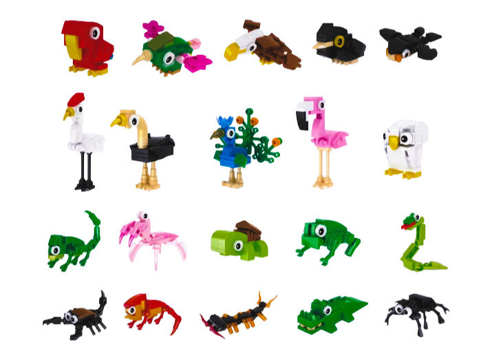 Elk doosje bevat 20 bouwsteentjes waarmee kinderen hun eigen kleurrijke vogel kunnen maken.