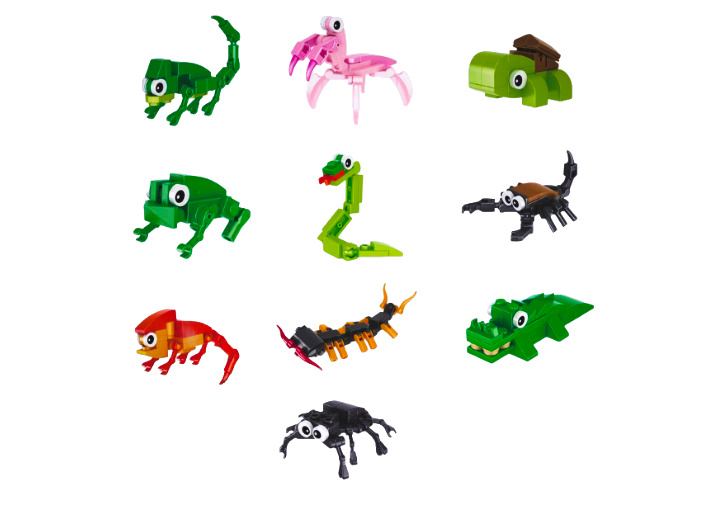 Elk setje bevat ongeveer 20 bouwsteentjes waarmee kinderen hun eigen dier kunnen bouwen: van een krokodil tot een kikker, van een spin tot een schildpad.