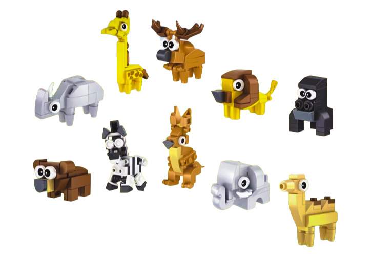 Elk setje bevat ongeveer 20 bouwsteentjes waarmee kinderen hun eigen dier kunnen bouwen: van een olifant tot een giraffe, van een leeuw tot een kameel.