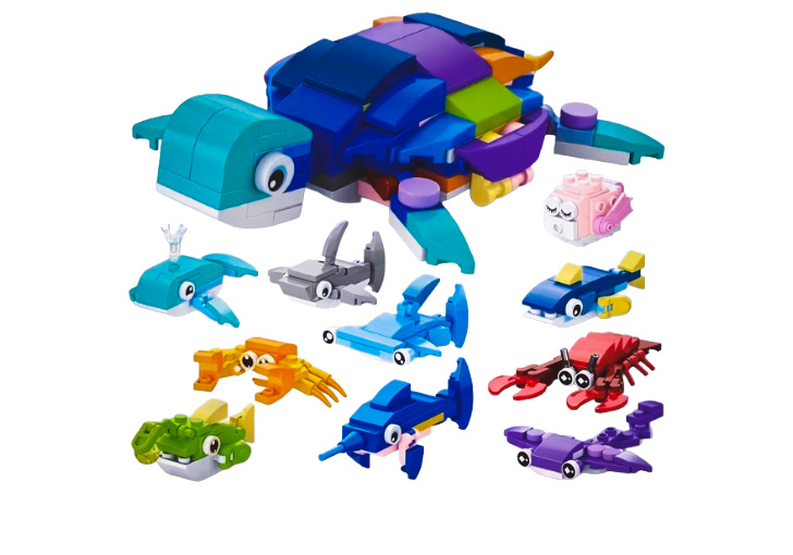 Wil je trakteren met iets dat nét even anders is? Deze mini‑bouwsetjes met vrolijke zeedieren zijn een echte hit bij kinderen. Elk setje bevat ongeveer 20 bouwsteentjes waarmee ze hun eigen oceaanvriendje kunnen bouwen: van een schildpad tot een dolfijn, van een krab tot een rog.