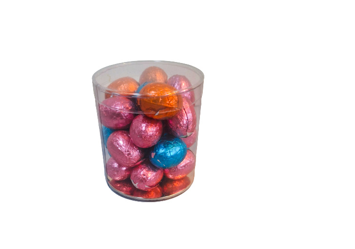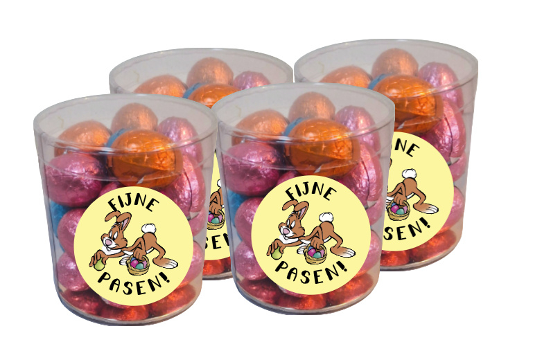 De potjes hebben een hoogte van 7.5 cm. en 7cm. doorsnee en worden gevuld met +/- 175 gram chocolade eitjes