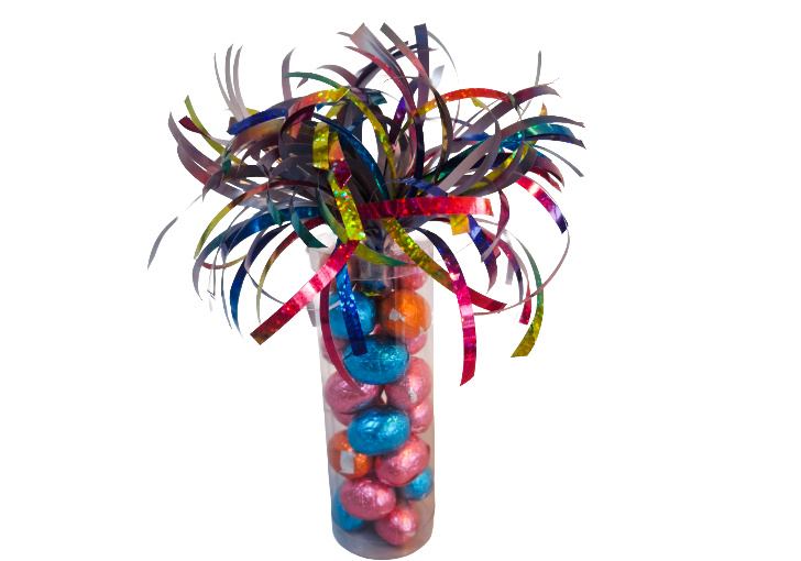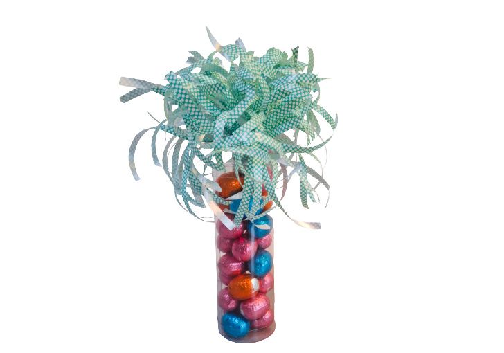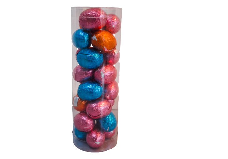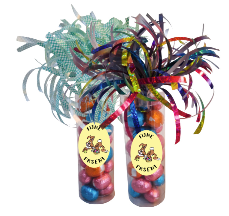 De potjes hebben een hoogte van 14 cm. en 4.5 cm. doorsnee en worden gevuld met +/- 175 gram chocolade eitjes
