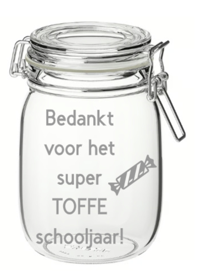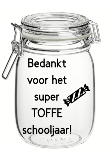 Het schooljaar zit erop, en dat verdient een waardering! Deze weckpot met de tekst "Bedankt voor het toffe schooljaar" is het perfecte cadeau om je favoriete leraar, mentor, of klasgenoot te bedanken voor een geweldig jaar. Vul de pot met lekkers, notities of kleine herinneringen en geef hem als bedankje voor alles wat er gedeeld en geleerd is.